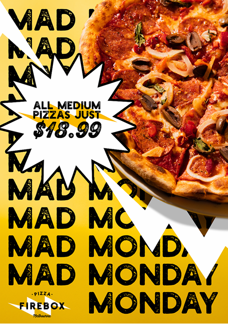 Start your week with a bang! Mad Monday Pizza is here to kick off your Monday madness with bold flavors at unbeatable prices ALL MEDIUM PIZZAS $18.99