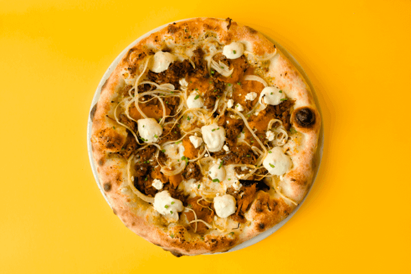 Garlic base, mozzarella, slow braised lamb shoulder, roasted pumpkin, spanish onion, fetta cheese, mint yoghurt.
