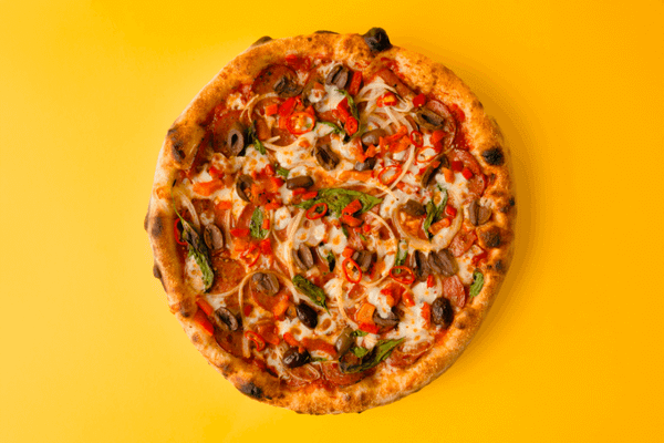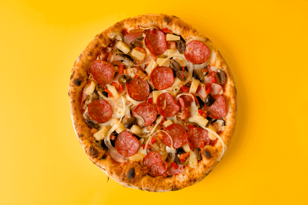 Tomato base, mozzarella, ham, smoked pancetta, onions, red peppers, mushroom & pineapple