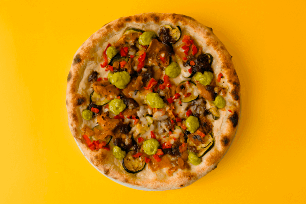 Vegan cauliflower puree, vegan mozzarella, caramelized onions, roasted pumpkin, zuchini, roasted red peppers, avocado puree(VE)