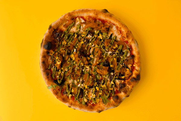 Tomato base, mozzarella roasted pumpkin, caramelized onions, rocket, fetta cheese, almond dukkah, basil pesto (V)