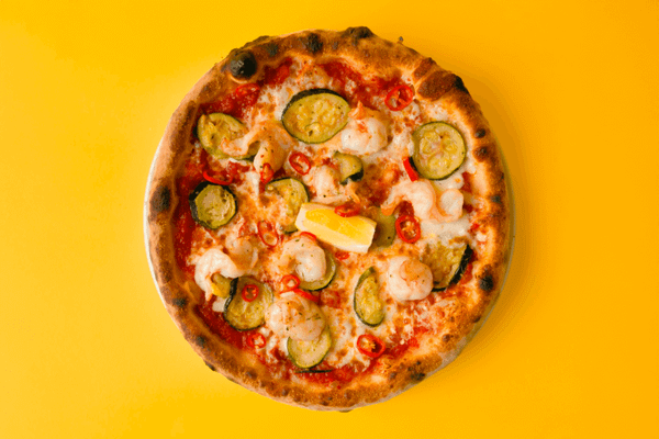 Tomato base, mozzarella, SA tiger prawns, zucchini, lemon, parsley