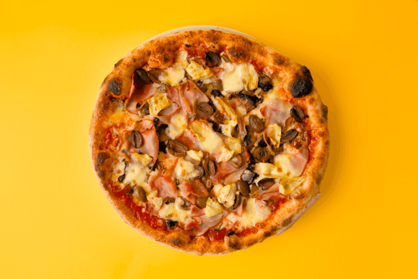 Tomato base, mozzarella, smoked ham, mushroom, artichoke hearts, black olives