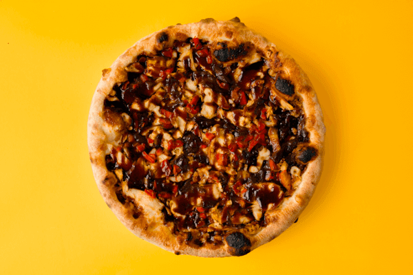 Tomato base, mozzarella, chicken breast, onion, roasted peppers, smoked barbecue sauce