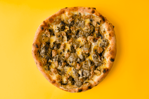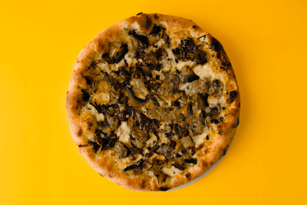 Garlic base, mozzarella, porcini and portobello mushrooms, caramelized onions, rosemary, truffle oil (V)