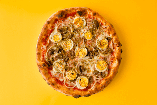 Tomato base, mozzarella, double smoked ham, onion, black olives, hard boiled egg, oregano