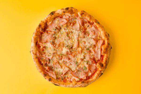 Tomato base, mozzarella, ham, smoked pancetta, egg