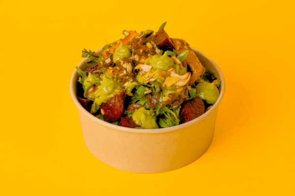 A wholesome delight! Roasted pumpkin paired with shaved kale, zucchini, baby beetroot, avocado purée, and a sprinkle of almond nut dukkah. Fresh, vibrant, and packed with flavour. (GF, EF, V)